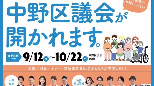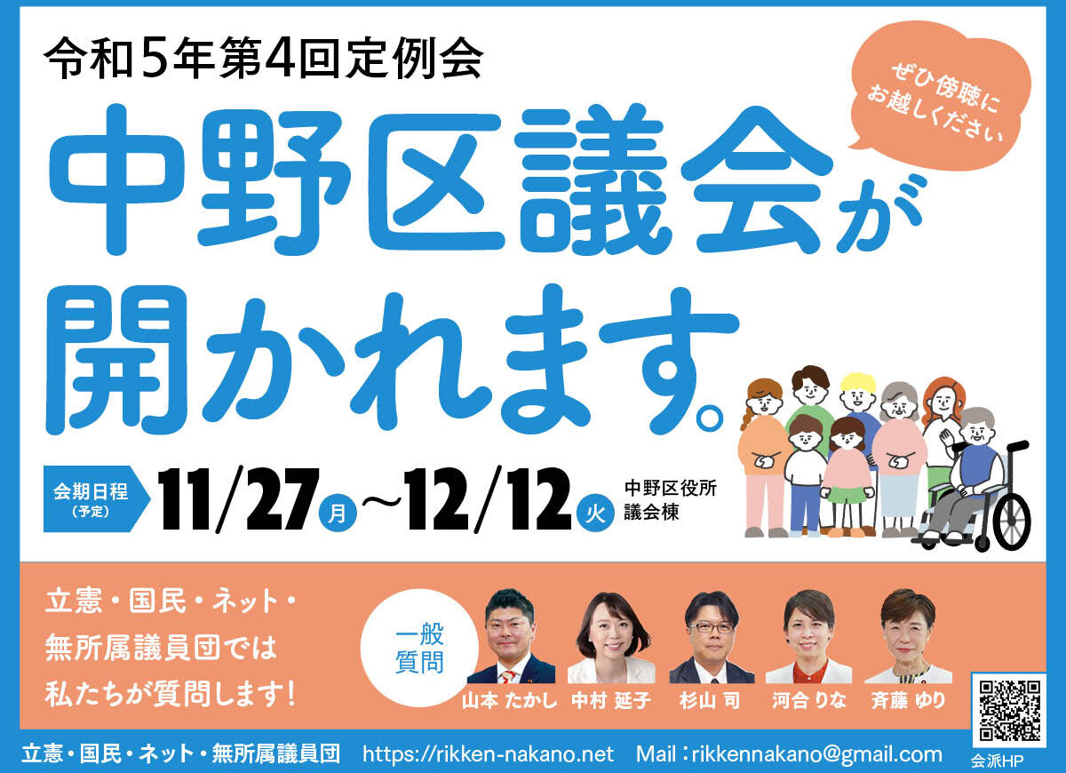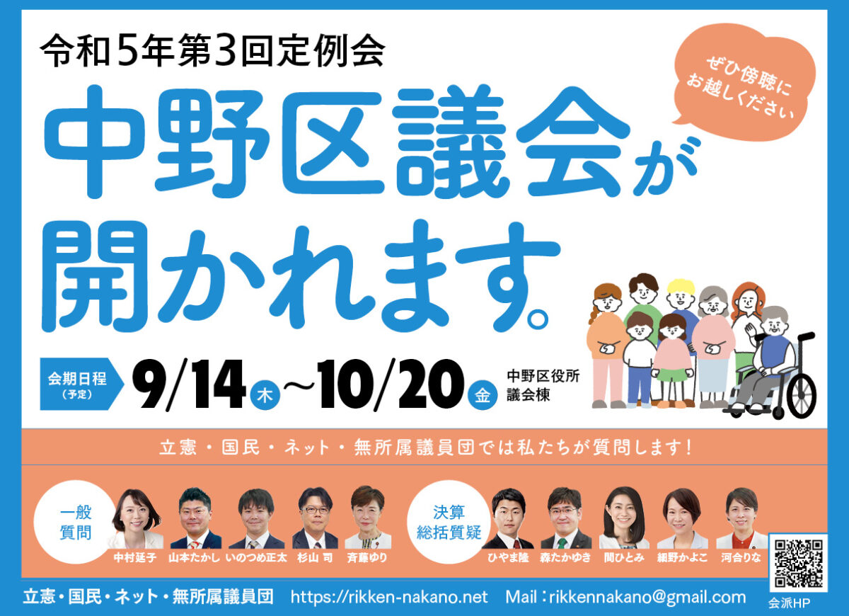 お知らせ 9/10(火)~10/21(月)中野区議会・令和6年第3回定例会が開かれます。ぜひ傍聴に来てください 2024年9月10日 rikken-nakano https://rikken-nakano.net/wp-content/uploads/2023/05/logo-nakano-rikonemu.png 中野区議会 立憲・国民・ネット・無所属議員団