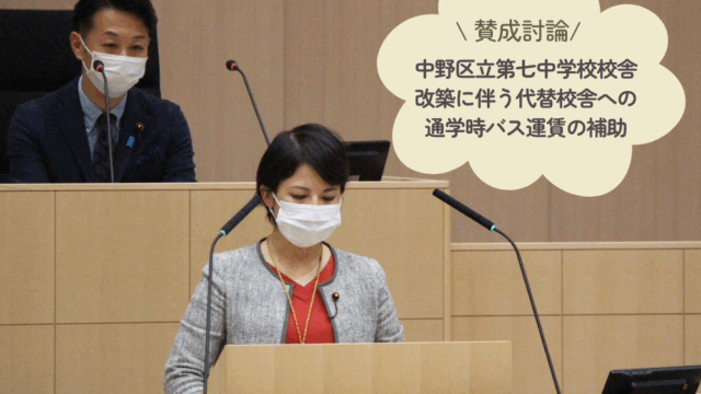 討論・議会報告 第13号陳情「中野区立第七中学校校舎改築に伴う代替校舎への通学時バス運賃の補助を求める陳情」に対し賛成討論を行いました。 2025年3月21日 rikken-nakano https://rikken-nakano.net/wp-content/uploads/2023/05/logo-nakano-rikonemu.png 中野区議会 立憲・国民・ネット・無所属議員団