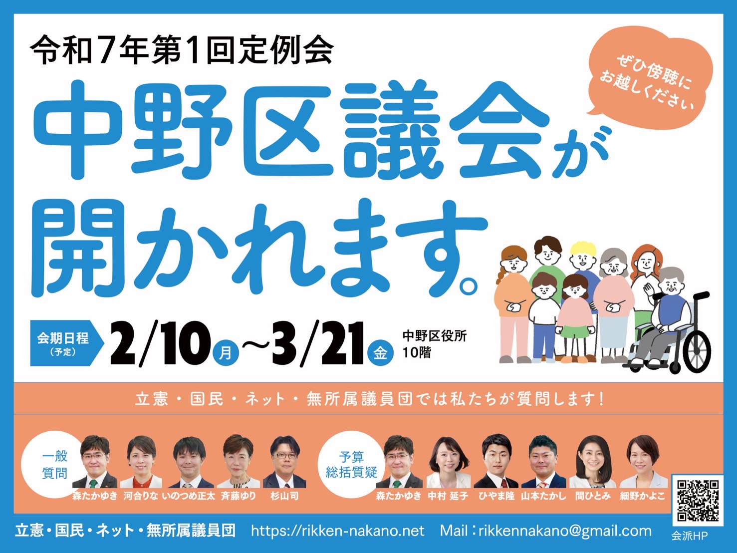 2/10(月)~3/21(金)中野区議会・令和7年第1回定例会が開かれます。ぜひ傍聴に来てください