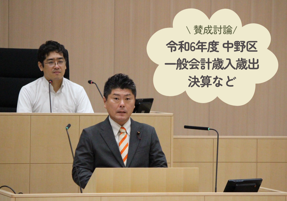 認定第1号、令和6年度中野区⼀般会計歳⼊歳出決算の認定について、認定第5号 令和6年度中野区介護保険特別会計歳⼊歳出決算の認定につきまして、⽴憲・国⺠・ネット・無所属議員団の⽴場から賛成の討論を致します。